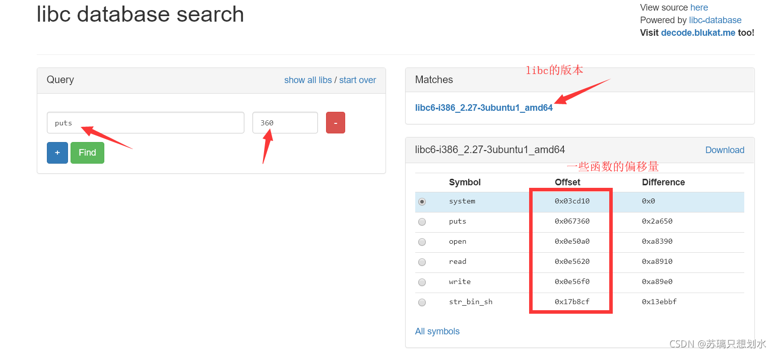 我们可以先运行exp1(见0x04)拿到获取puts的真实地址,然后去libc- database -search的网站查询,可得到puts函数system函数和binsh字符串对应的偏移地址
